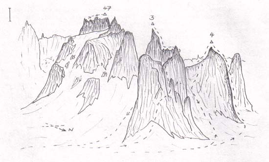 Diagram showing route taken up Ivory Tower (3) and Ben Trilleachan (4). Agdlerussakist (47) rises above them and was climbed later from Nameless Valley in the Land of the Towers. 4. BEN TRILLEACHAN - South and North ridges (880 m) (60 deg 9` N, 44 deg 32` W). First attempt by R.Sharples, C.Matheson, D.Gaskell and P.Aldred* on 21st June 1975. First ascent by South ridge by D.Gaskell and P.Aldred* on 6th August 1975. Grade: AD+ . Time: 10 hours. Second ascent by North ridge by J.Cant, and P.Aldred* on 17th August 1975. Grade: D Time: 8 hours. This peak is one of the subsidiary spurs from the complicated structure of Agdlerussakasit. It is about two miles up the main valley from base camp and on the south side. It is characterised by being ringed with crackless holdless slabs. The first ascent was done much later on during the expedition. It took the same approach but the snowfield had completely disappeared. On a ledge at our previous high point we roped up and donned our P.A.'s which proved virtually essential for the climbing ahead. We started diagonally across a blank slab on pure friction climbing for 250 feet which luckily had a crack, albeit a hairline one, in the middle for a peg belay. We continued up broken crack systems interspersed with steep friction climbing to the col. A few hundred feet of broken climbing brought us to a vertical holdless wall; a good excuse for a lunch stop. Half a dozen shaky pegs were needed in the overhanging crack. This was followed by a couple of pitches of steep climbing and brought a strenuous end to a delicate climb. On our return one abseil was followed by a 3-point contact (backside and feet) descent down the slabs and brought us back to the valley. The second ascent up the north ridge had been talked about for a long time as offering a superb 1000 metre line up the mountain but it was semi-dismissed as being impossible due to the ring of steep slabs round the bottom. Thus it was very half-heartedly that John and I set off on the last climbing day of the expedition to have a look at it ! The slabs yielded relatively easily to the frictional properties of the P.A. even though we occasionally had to climb without belays. It was higher up where the ridge steepened and became more broken that the difficulties arose but even these were passed reasonably quickly. So it was with great surprise and happiness we found ourselves on the summit only 4½ hours after starting up the ridge. We descended by the south ridge as before.