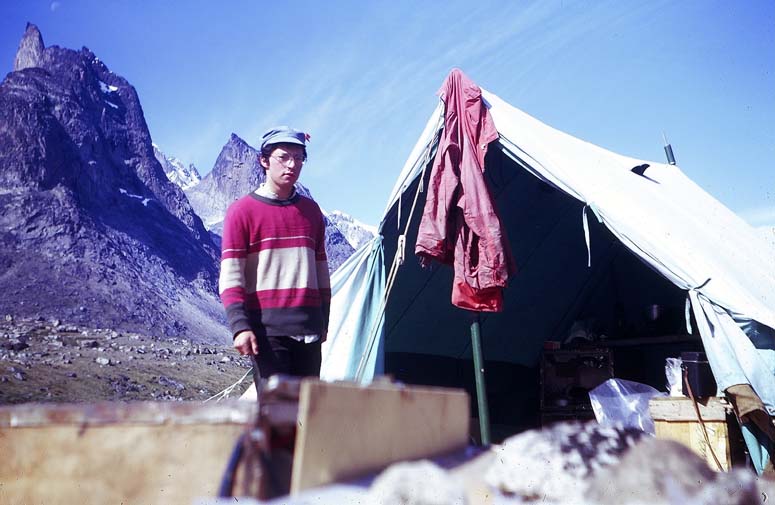 John Cant at Basecamp with Ivory Tower in top left corner, and Ben Trilleachan behind his head. 3. IVORY TOWER - North face/ridge (1090 m.) (60 deg 9` N, 44 deg 31` W). First attempt by D.Brown, J.Cant*, R.Sharples on 26th July 1975. First ascent by D.Brown, J.Cant*, D.Gaskell and R.Sharples on 28th July 1975. Grade: TD. Time : 20 hours. Guarding the south flank of the Great Valley are four towers : bastions of ridges running up to the 5000 feet plus peaks of Andy's Rucsac and Birdseye View. Small in comparison, these towers nevertheless catch the eye first, presenting sheer rock walls shooting straight from the valley floor. The first, a clean-cut fin sprouting from a buttress of loose rock; the second a shapely sea of slabs; the third, small yet possibly the hardest; the fourth, sheer, complex, the last before Sallies Kitchen. The first attempt at Tower Number One was a half-hearted affair, started in the late hours of a fog-ridden morning, and finished amongst the rubble of the east side of the buttress supporting the tower. Access and retreat was by a snow gully running up the col south of the tower. 3 o'clock heralded attempt number two. The great crack-fault in the north face of the buttress was quickly climbed and by 9 am we were on the ridge, frustrated below an unexpected sheer wall of rock, barring progress. As Dave started to count his pegs, Ray led off to the right on a traverse line circumnavigating the obstruction. Three hard pitches followed - a vertical wall, edged across on minute holds; a slanting ledge of loose blocks that heeled into space at the least touch; and a strenuous V crack. Scrambling led to the main tower. "Impossible", was the first rope's verdict : Ray fell asleep and I reclined behind Dave's camera as the second rope took over. Dave led two pitches from below. He appeared to be climbing smooth black walls and pegging cracks. Unfortunately he seemed to be making progress, so Ray was awoken and we followed. The first pitch (V) was classic - perfect overhangs and jamming cracks, leading to a big ledge. Ray's boots by this time had lost the vital foremost inch of rubber and he could not trust them on the very small holds presented by the next crux pitch. I led on from an overhang crack onto wrinkles on a steep wall. Balance up, no handholds. Grab for a crack and tenuous pull up onto a ledge. Where to go ? Round left, over the void the overhang above was broken by a line of small flakes. It looked too committing - were the flakes loose? Dave had done it .... so ... . Whew! The summit arrived after a few short problems, but the howling gale and the late hour pushed us down, dithering between the various possible descents. We shot down, fleeing before the night, met up with our first attempt and completed the traverse into the gulley in torchlight.