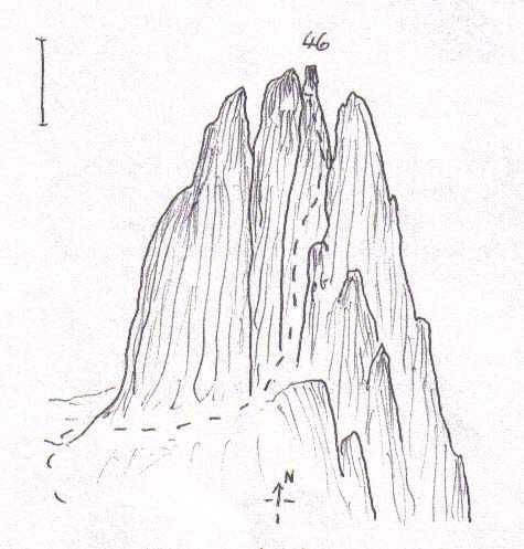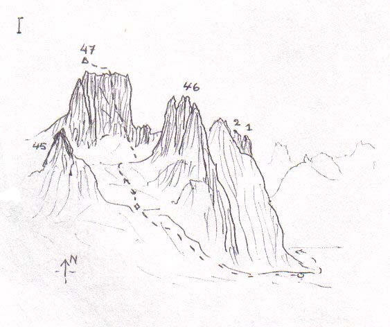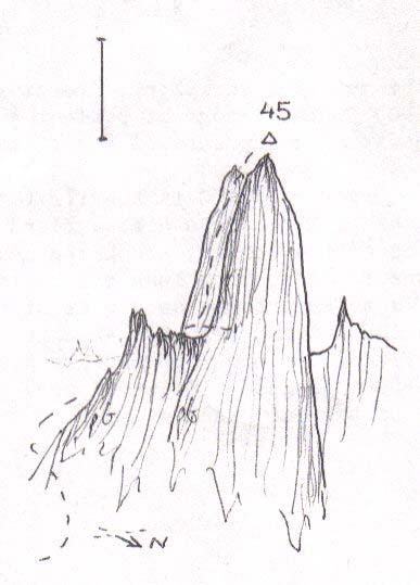 Above: Diagram showing route taken up Agdlerussakasit (47) which was ascended by the south wall