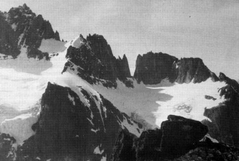 The party made an early start from their desolate camp close to a high loch in the valley. They went up steep rocky slopes and crossed the valley rim onto the broad crevassed snowfields that run in a high bank round the north-east rim of the Land of the Towers. Surprisingly they saw lines of weakness going up the right end of the south face and on closer approach they found that they could scramble cautiously well up the face. Four rock pitches took them onto the knife-thin crest of the mountain. With breathtaking views of tangible exposure they walked over a battlement of blocks to the highest point. There they were bewildered to find what could only be a "natural" cairn of upended flakes balanced on the tip - they found it hard to believe that neither the crusading French nor the remarkable Tilman had not been there before them. To ensure that they were on the highest point, Sharples stuck himself on a slender nearby spire to pose for a photo under the lowering mist clouds. They retraced their pitches, but unwilling to bivouac in the worsening weather they walked and eventually staggered back to their tents in the darkness. The honour of the expedition had been well satisfied by the culminating efforts of the hard men of the Land of the Towers.