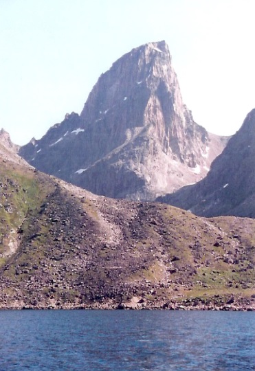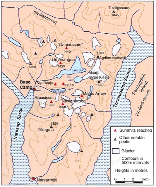 This British team of climbers approached the Agdlerussakasit / Maujit Qaqarssuasia group from the west, and a basecamp at the head of Narssap Sarqa, before the fjord bends round into Amitsuarssuk. They had originally planned to base at Stordalens Havn to the north, but on discovering it had been the base for the St Andrews expedition in 1975, who had climbed many of the peaks, they opted for the more southern base instead. From here the mountains around the Blue Lake, Maujit Lake, and the lake marked 560m became accessible between July 24th and August 13th 1996.