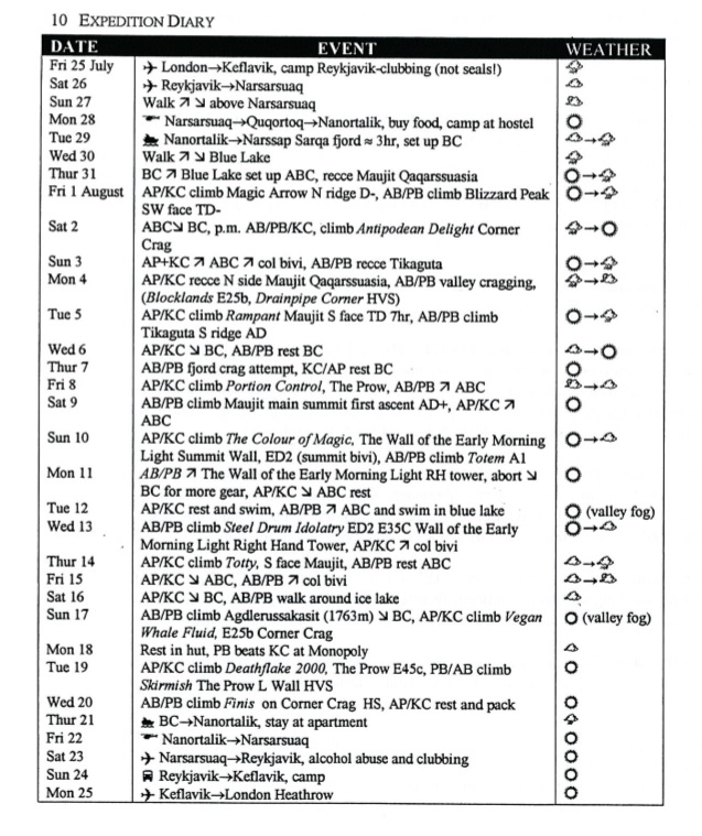 1997 Scottish Torssukatak Spires Expedition: second ascent of Agdlerussakasit, first ascent of Maujit Qaqarssuasia with Pete Benson, Andy Benson, Kenton Cool and Al Powell. Approaching from camps west of the Torssukatak towers, they made 18 ascents. This included the first ascent of the main (highest) summit of Maujit Qaqarssuasia, and two routes on its South Face - 'Rampant' and 'Totty'. They also made the second ascent of Agdlerussakasit.