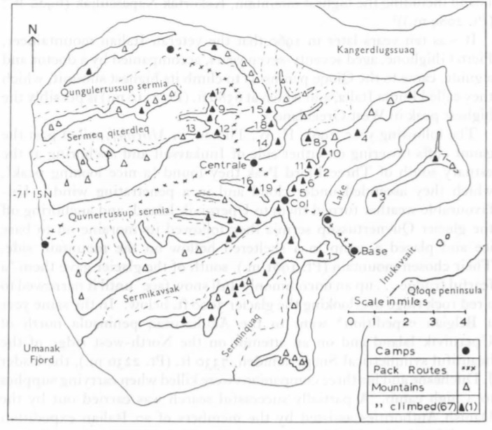 THE 1967 UNIVERSITY OF ST ANDREWS WEST GREENLAND EXPEDITION was led by Dr PWF Gribbon, a Physics lecturer from the University of St Andrews, Scotland. The introduction and mountaineering history: In June, 1967, after more than a year's planning and organisation, all eight of us sailed from Newcastle to Denmark en route for the mountains of Upernivik Island off the West coast of Greenland. We were members of an expedition designed to encourage adventure travel and sport within the University; our scientific programme was subsidiary to this main aim but was designed to fit in with the interests and qualifications of the members. We were the eighth Greenland expedition by members of the University since the war. Four of these were scientific expeditions organised by the geologist H.I. Drever, while the other three were mainly mountaineering-recreational ones to the Tasermiut fjord region of South-west Greenland, to the Caledonian Alps of the Angmagssalik region of East Greenland in I963, and to the Ikamiut fjord area of Sukkertoppen in West Greenland in 1965. Apart from myself our present party comprised: Alan North (Aberdeen), Alan Robertson, John Hall, Roger Nisbet, Bill Band, David Meldrum and Wilf Tauber. Drever has called Upernivik Island the most beautiful in Greenland. Greenlanders go there from the surrounding hunting communities to gather berries, fish, and lie in the sun; otherwise it is uninhabited by man. Its mountains rise to nearly 7000 ft. and there are at least seventy-five distinct summits within its roughly circular shape: a high mountain density for an island whose greatest width is about fifteen miles. Narrow steep-sided fjords fringe its north and east shores, while the west and south coasts face open water towards Ubekendt Island and the Nugssuaq peninsula of the mainland. The mountaineering history of the island must include the neighbouring parts of the mainland, if only to compare the quality of the mountaineering potential in different places. In 1938 Drever accompanied by a Greenlander seal hunter John Zeeb, crossed by kayak from Ubekendt Island to a glacier steeply descending to the north shore from the central snowfields of Upernivik Island, and 'with provisions for two days, an ice-axe, a rope, crampons, ice-piton, camera, compass, aneroid, pocket sextant, primus, a geological hammer and a waterproof sheet to sleep under' they set off on the first crossing of Upernivik Island. Sixteen hours later they had completed their journey to the western coast at the snout of Quvnertussup sermia (see map), the longest, broadest and least crevassed of the western glaciers. At their highest point they saw 'the finest and most beautiful sight, a peak well over 7000 ft., rising from a southerly arm of the glacier from about 3500 ft. It had a clean-cut form, a sharp snow ridge rising on the northern side right from the glacier to a few hundred feet from the top. This ridge had steep snow walls on either side. The evening light gave it a lovely delicate pink and to a little ice on the north-east wall a delicate green. The rugged rock summit relieves the symmetry of the ridge, and though the latter, I think, could be climbed the summit might prove impossible.' In 1967 the St. Andrews expedition climbed this formidable mountain, the Horns of Upernivik (illustration no. 21) but more of this later. The first recorded ascent was that of 'a beautiful symmetrical pyramid of 6893 ft', Palup Qaqa or Paulus Peak (Pt. 2101 m.) on August 8, 1939 by two St. Andrews students, K. A. Swales and K. A. W. Paterson. In 1950 another St. Andrews expedition returned to carry on the geological work on Ubekendt Island, and the four 'working' mountaineers achieved further ascents: 4 on the north-west corner of Upernivik Island including the highest mountain, Kakortak Napassuliak ( 6900 ft. : (Pt. 2089 m.)) It was ten years later in 1960 that the veteran Italian mountaineer, Piero Ghiglione, aged seventy-seven years, accompanied by a doctor and a guide, came to the Qioqe peninsula to climb its highest summit, which they called Punta Italia, and which at 6580 ft. (Pt. 2310 m.) is possibly the highest peak in West Greenland. The following year, 1961, H.W. Tilman, in Mischief, sailed past the gaunt cliffs towering on either side of lnukavsait and anchoring at the estuary south of Three Fjord Peak they found 'a nice looking peak', which they ascended under cloud and in a penetrating wind. Unfavourable weather turned them to Upernivik Island, and anchoring off the glacier Quvnertussup sermia they followed its moraine on to bare ice and placed a camp in a sheltered hollow on the mountain side. Their chosen mountain (Pt. 1961 m.), south of the glacier gave them 'a fearful trudge ... up an uncommonly dull snow face' until it narrowed to a red rock ridge overlooking the glacier 3000 ft. below. In the same year a Belgian expedition went to the Akuliarusaq peninsula north of Upernivik Island and on an attempt on the North-west ridge of the beautiful symmetrical Snepyramiden, 7330 ft. (Pt. 2236 m.), the leader J. Duchesne and his three companions were killed when carrying supplies to a high camp. A partially successful search was carried out by the Danish Authorities assisted by the members of an Italian expedition bound for the Devil's Thumb at 74° N. and the first ascent of Snepyramiden was made. Heights expressed by Pt. 2101 m. etc., refer to spot heights marked on the current Danish Geodetic Institute maps, 1:250,000: 70 V. 1 and 2. Any discrepancies between the height in feet and the spot height in metres are due to the former being a measured height in feet obtained by an expedition or from unpublished G.G.U. data. In 1965 the first large scale expedition to Upernivik Island was undertaken by an eight-man party from the Club Alpino Italiano (Milan section). They established their Base Camp on the south bank of the Sermikavsak glacier, and during July and August climbed extensively in this valley, putting up 