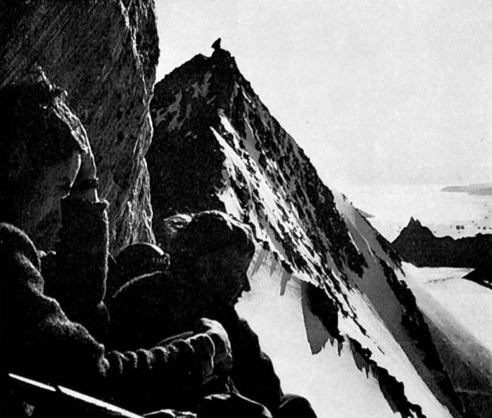 Upernivik Island: Nisbet and Band on descent from Merdor. Photo: Dave Meldrum On the golden night of July 28, the last supplies were carried up from the dump, and everyone, bowed beneath their cumbersome loads, transferred to Camp Centrale. Two parties went out on July 30. The 'hard' party of Robertson, Tauber, Nisbet and Meldrum took the big mountain, the Great White Tower, by its South ridge, Grade III, to make the second ascent of this beautiful peak in a sixteen-hour day. The 'lazy' party of North, Hall, Band and myself followed the West ridge above Camp Centrale, and after many interesting gendarmes reached the sweeping snow summit of Spume, c. 6000 ft., Grade IV, in seven hours, before going north down a narrow snow ridge until forced to abseil off the West face. We were now waiting for our tour de force: the ascent of the Horns of Upernivik. We had made a circuit round this mountain looking for the easiest route of attack and had been brought back to a contemplative assessment of the North-east ridge, well described by Drever in 1938.