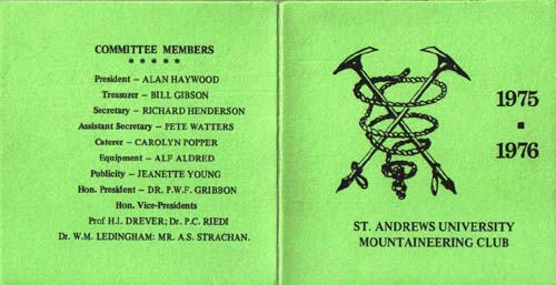 1974-1975 October 13th: Day Meet to Crianlarich October 25th-27th: Weekend Meet to Clachaig and Blackrock Cottage, Glencoe November 8th-10th: Weekend Meet to Derry Lodge, Cairngorms November 22nd-24th: Weekend Meet to Kintail December 29th-January 5th: Annual Feich Trip in Knoydart January 12th: Day Meet to Glen Clova January 24th-26th: Weekend Meet to Jean's Hut, Northern Corries + Meal Monday Meet: Meets to Ling Hut, Torridon; and The Smiddy, Dundonnell February 22nd-24th: Weekend Meet to Culra Lodge Easter Vacation: Meet to North West Highlands, finishing at Kinlochewe April 13th: Day Meet to Arrochar April 18th-20th: Weekend Meet to Ardgour June, after exams: Meet to Glenbrittle, Skye Summer: St Andrews University Expedition to Cape Farewell, Greenland